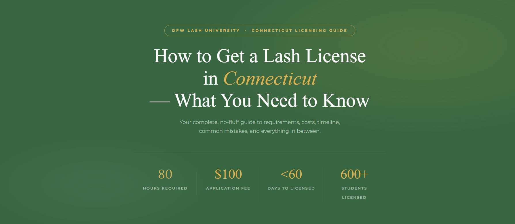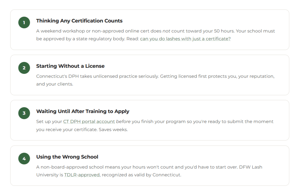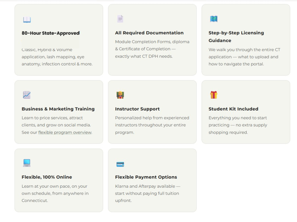 The good news? Connecticut’s process is one of the most accessible in the country. You only need 80 hours of approved training, no written state exam, and the application is done entirely online. For a broader look at licensing across the U.S., read our 2026 guide to becoming a licensed lash artist in the USA.