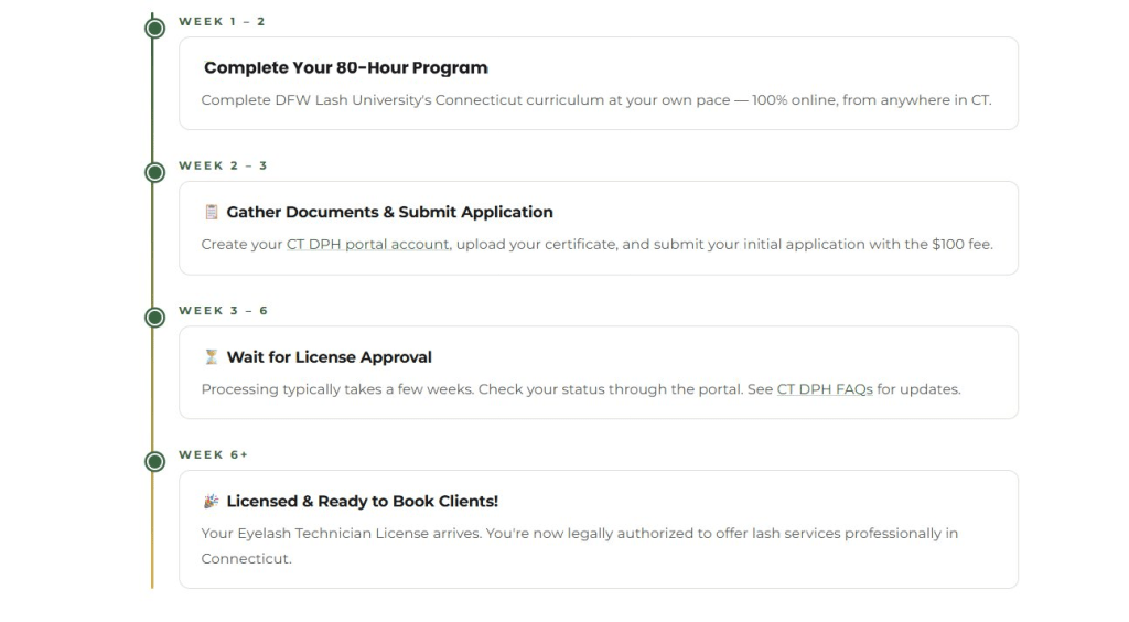 Based on the official Connecticut DPH Eyelash Technician Licensing Requirements — here’s exactly what you need.