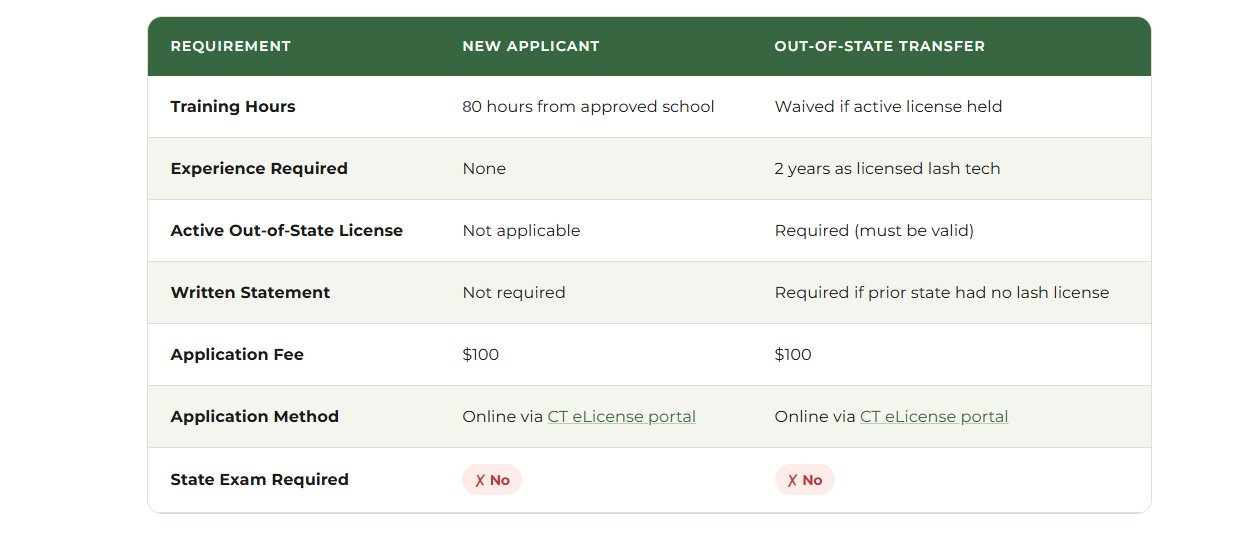 The good news? Connecticut’s process is one of the most accessible in the country. You only need 80 hours of approved training, no written state exam, and the application is done entirely online. For a broader look at licensing across the U.S., read our 2026 guide to becoming a licensed lash artist in the USA.